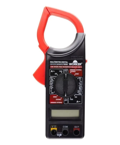 O Multimetro Digital com Alicate Amperimetro Worker é ideal para medi correntes em motores eletricos, redes de distribuição e intalação de dificil acesso. Foi projetado pra efetuar medidas de paramentros eletricos sem necessidades de se interromper o circuito de corrente.