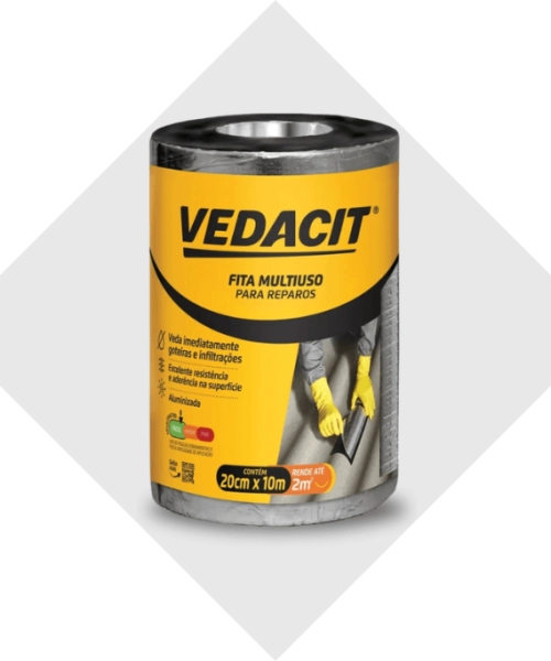 A FITA MULTIUSO AUTOADESIVA VEDACIT é uma fita asfáltica impermeável, produzida à base de asfaltos modificados com polímeros e elastômeros, que apresenta excelente aderência a vários substratos. Possui estruturante não tecido resinado de poliéster que confere maior resistência e flexibilidade. A cobertura superficial de alumínio atua como barreira refletora dos raios solares e apresenta grande durabilidade. É de fácil aplicação, sendo um modo prático, rápido e eficaz de vedar imediatamente goteiras e infiltrações. Preparo do substrato