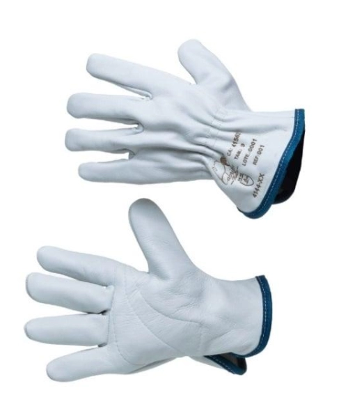 Luva de segurança confeccionada em vaqueta natural, reforço interno na palma, elástico de ajuste embutido no dorso e acabamento no punho com viés, costurada com linha nylon.